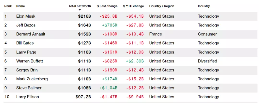 據彭博億萬富翁指數(Bloomberg billionaire Index)顯示,由于2022年1月的美股大跌,全球最富有的10大富豪的財富總計縮水了1730億美元(約合人民幣11000億元)。其中,扎克伯格的身家今年1月蒸發了152億美元,全球首富埃隆·馬斯克身家更是暴跌了541億美元;亞馬遜創始人貝索斯的身家也縮水了278億美元,總身家跌至1640億美元。